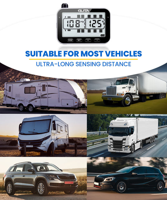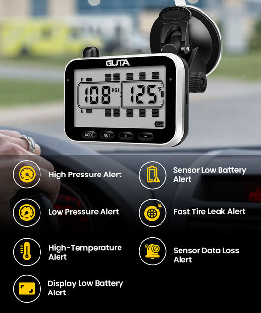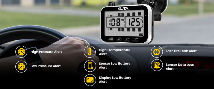 High and low-pressure alarms / high-temperature alarms/sensor low battery alarms / fast tire leak alarms/sensor data loss alarms/display low battery alarms. Allows you to focus on long-distance travel or freight.