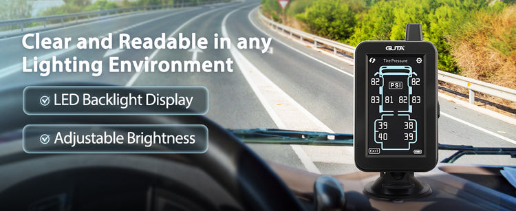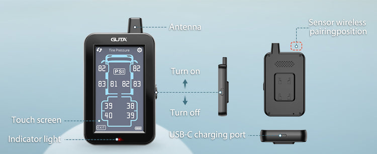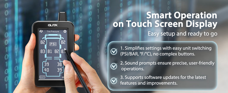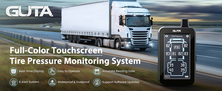 The GUTA GT80 TPMS features a full-color touchscreen for real-time monitoring of tire pressure (0–188 PSI) and temperature. Its intuitive interface with touch and sound feedback ensures effortless operation. Designed for optimal visibility in all lighting conditions, keeping drivers focused on long journeys