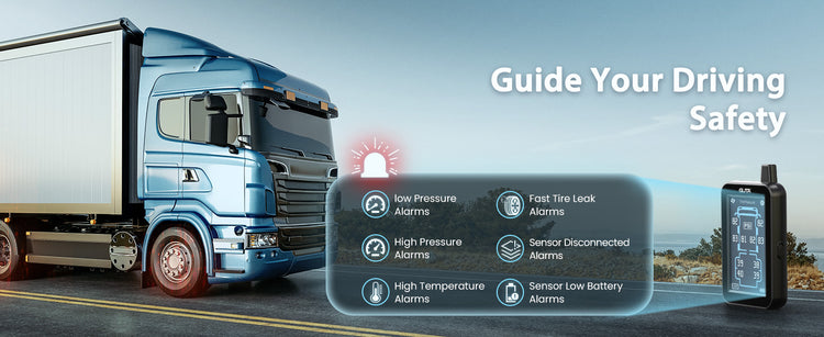 Monitors up to 22 tires with six alerts, including high/low pressure, high temperature, fast leaks, missing sensor signals, and low battery warnings. Provides instant visual and audio alarms when tire conditions deviate from safe parameters.