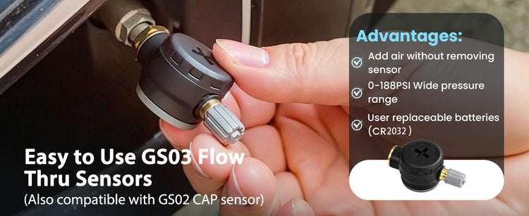 Equipped with flow-thru sensors, allowing tire inflation without removal. These compact, waterproof, and dustproof sensors provide highly accurate readings. User-replaceable CR2032 battery ensures long-term reliability. Sensors are pre-labeled and pre-paired for hassle-free setup.