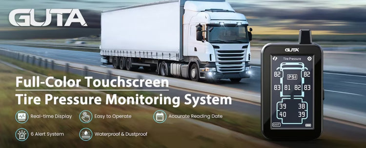 Das GUTA GT80 Reifendruckkontrollsystem (TPMS) verfügt über einen farbigen Touchscreen zur Echtzeitüberwachung von Reifendruck (0–188 PSI) und -temperatur. Die intuitive Benutzeroberfläche mit haptischem und akustischem Feedback gewährleistet eine mühelose Bedienung. Optimale Sichtbarkeit bei allen Lichtverhältnissen sorgt dafür, dass sich der Fahrer auch auf langen Strecken voll konzentrieren kann.