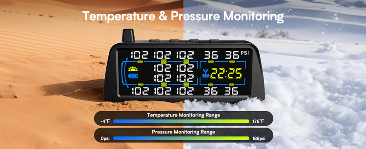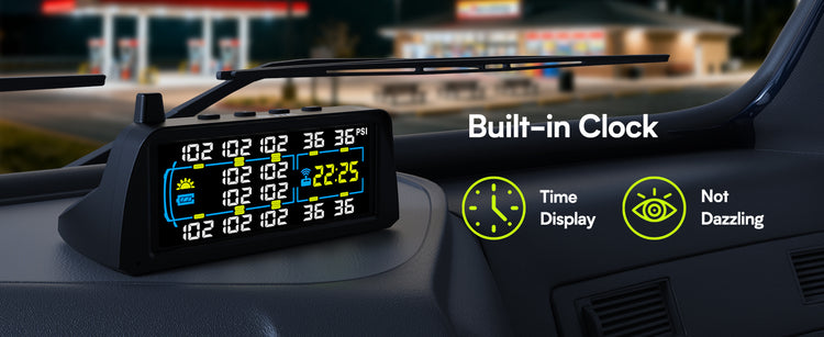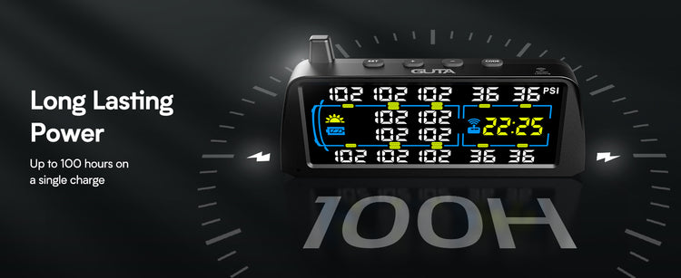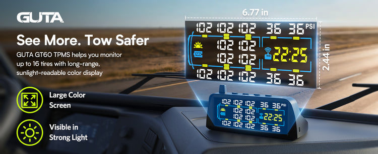 The GUTA GT60 TPMS features a 7-inch full-color LCD for real-time pressure (0-188 PSI) and temperature monitoring of up to 16 tires. The display auto-adjusts brightness for optimal day and night visibility, enhancing safety for motorhomes, trucks, and commercial fleets.