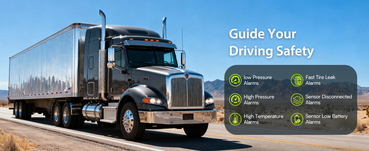 Features 6 alarm modes, including fast leak, high/low pressure, high temperature, sensor battery, and signal loss alerts. The system auto-sets reference pressure upon pairing, with alarm thresholds easily adjustable from +25% to -15% PSI.